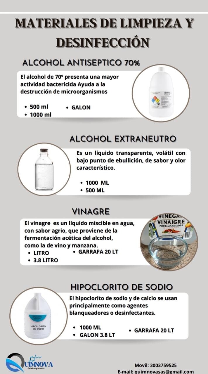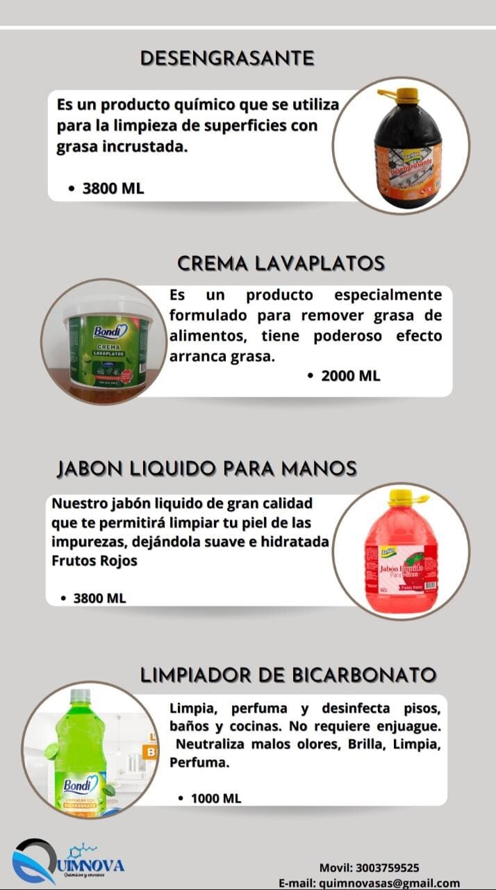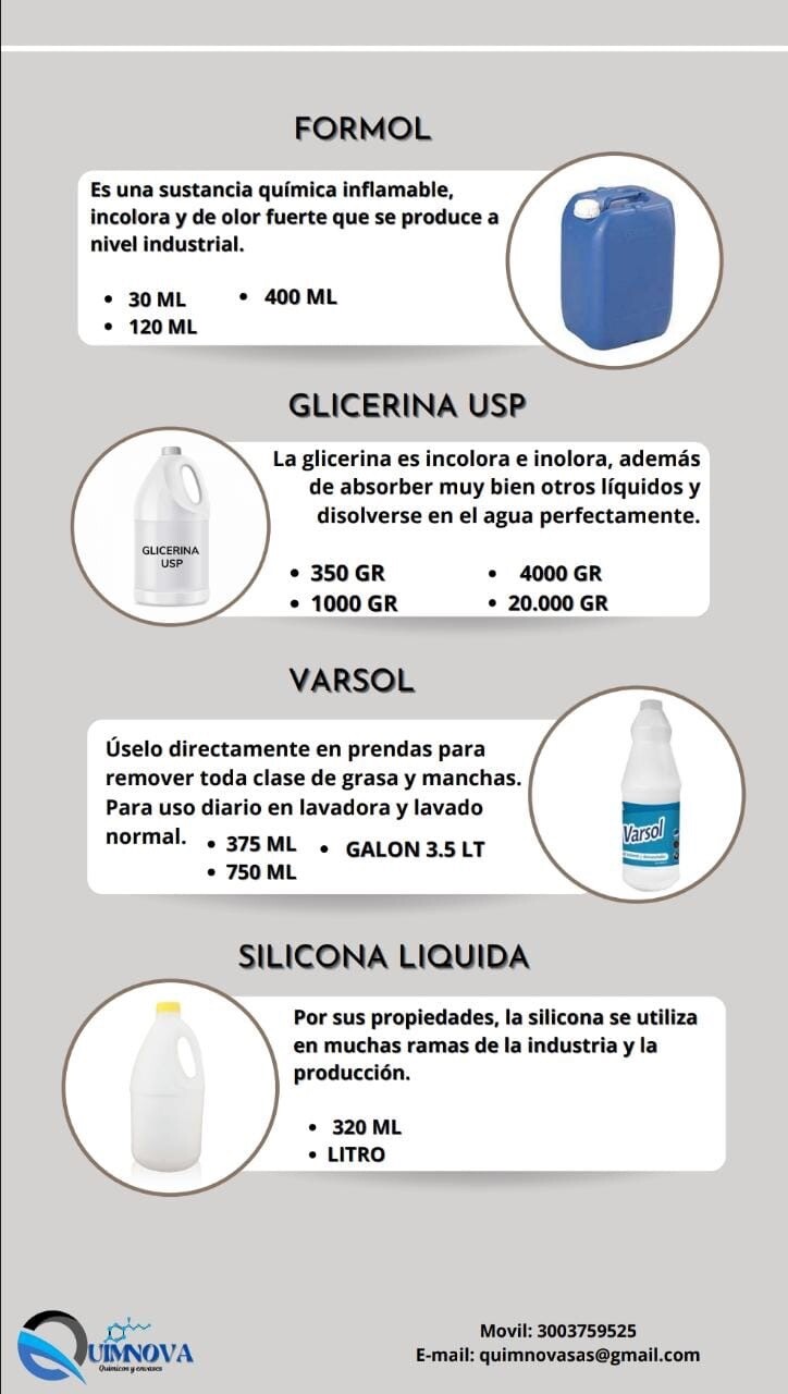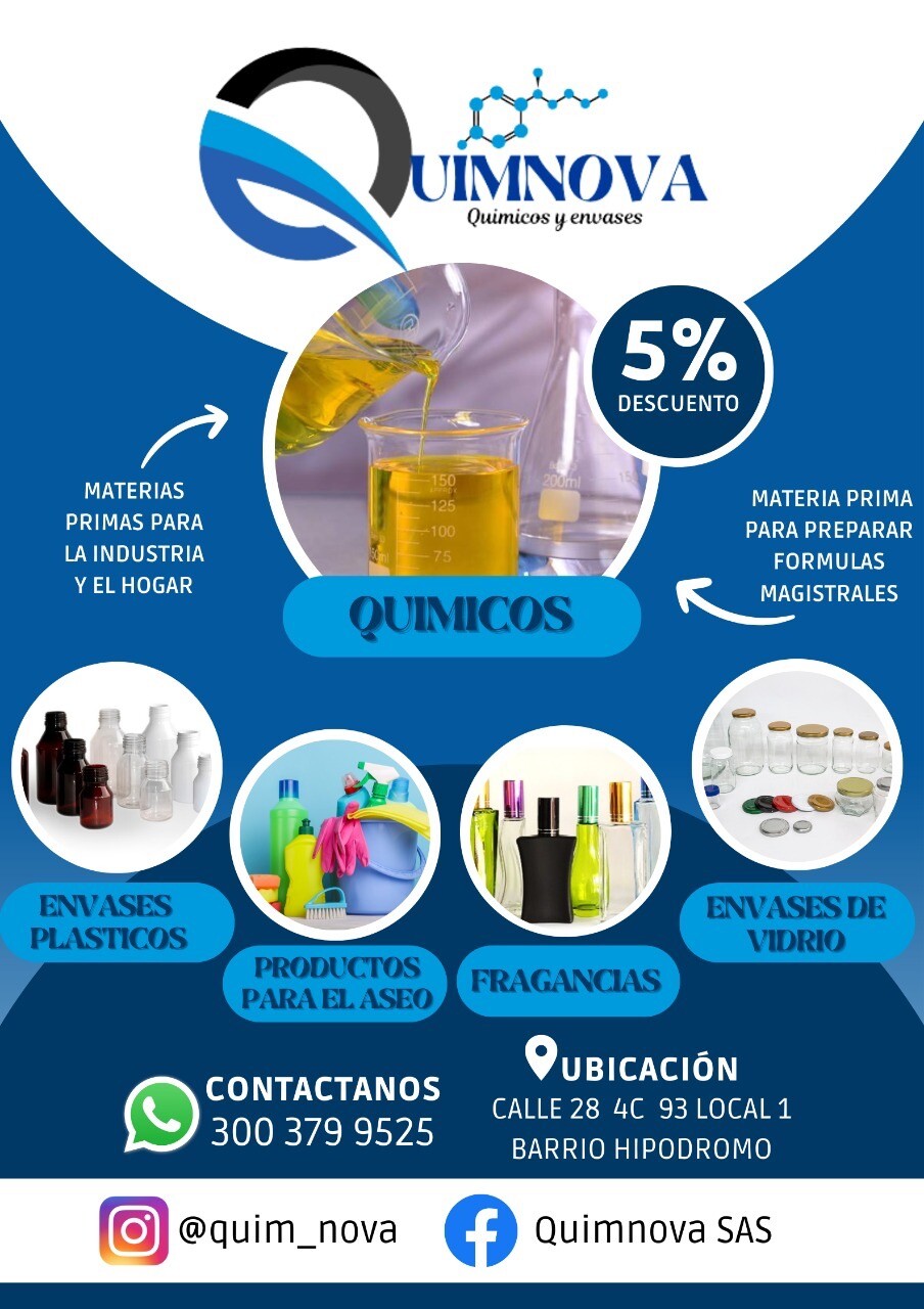 SOMOS UNA EMPRESA ESPECIALIZADA EN LA VENTA Y DISTRIBUCION DE PRODUCTOS PARA LA INDUSTRIA, EL HOGAR. Y EL CONTROL DE PLAGAS. COMO INSUMOS PARA EL ASEO TALES COMO JABONES, DETERGENTES, LIMPIAPIZOS, DESINFECTANTES Y DESENGRASANTES. ENVASES DE VIDRIO ,PLASTICO Y TAPAS. MATERIA PRIMA PARA LA PREPARACION DE FORMULAS MAGISTRALES TALES COMO EL BICARBONADO, ACIDOS, BENZOATO, SODA CAUSTICA, CLORURO Y SULFATOS. PRODUCTOS PARA LA LIMPIEZA O EL MANTENIMIENTO DE LAS PISCINAS COMO EL CLORO EN PASTILLAS CON ALGUICIDAS, CLARIFICANTES, SULFATO DE COBRE, CLARIFLOC Y CLORO GRANULADO. FRAGANCIAS PARA EL HOGAR Y EL USO PERSONAL. GLICERINA, HIPOCLORITO DE SODIO, CREOLINA, THINNER, VARSOL, FORMOL, ALCOHOL ANTISEPTICO, ALOCHOL ETILICO INDUSTRIAL Y ALCOHOL EXTRANEUTRO.