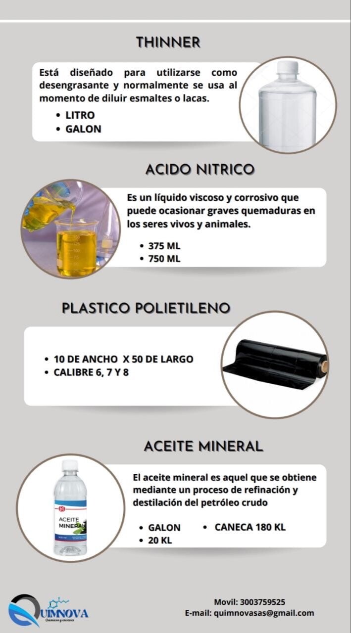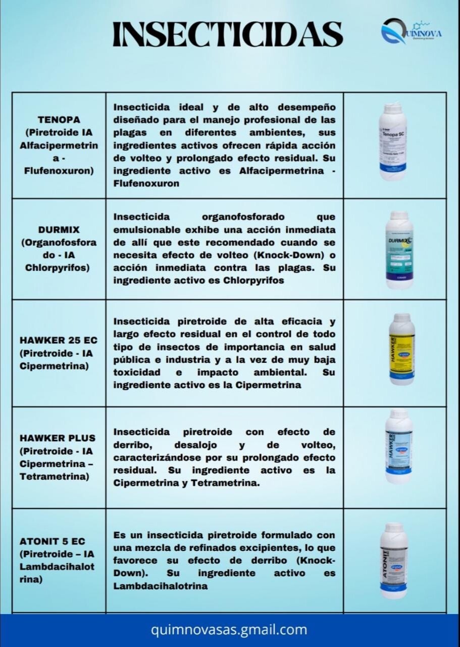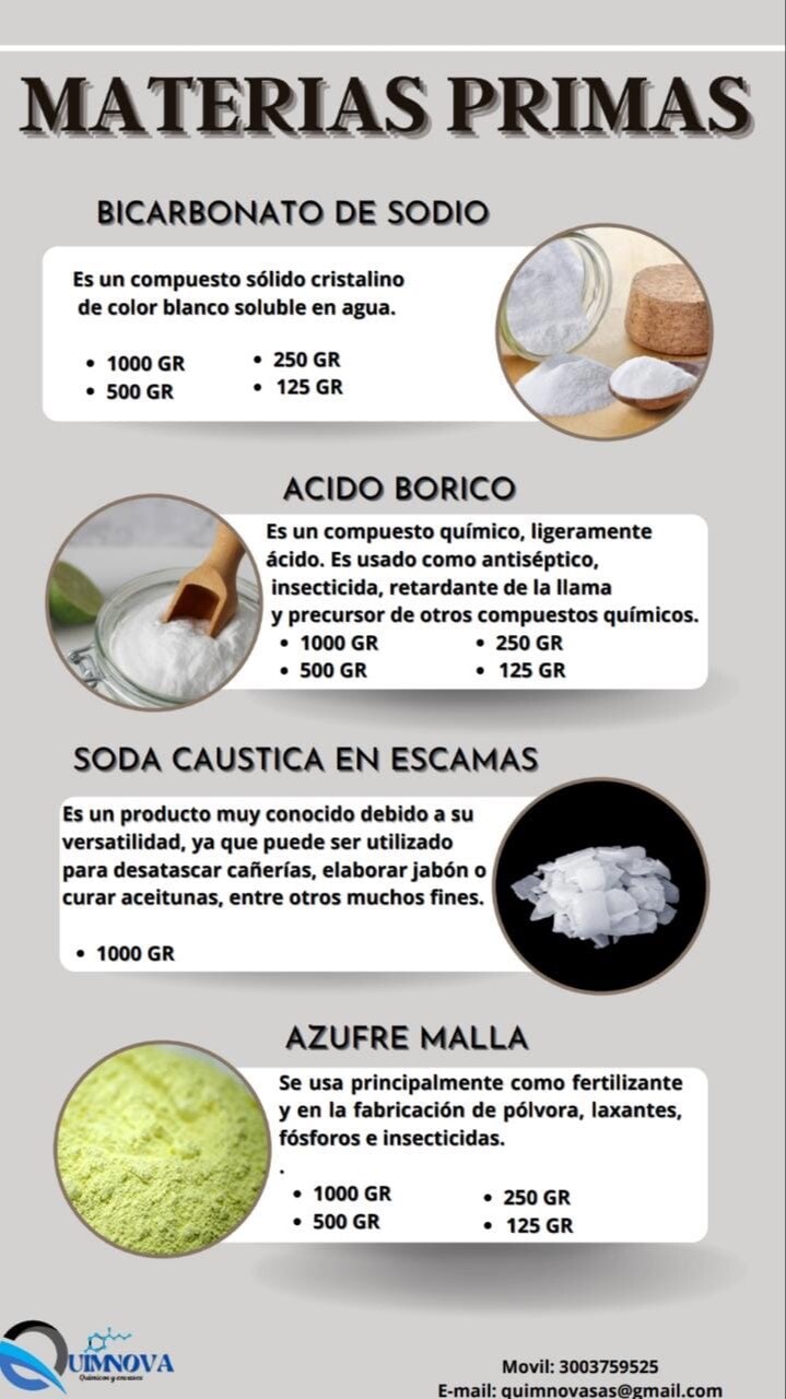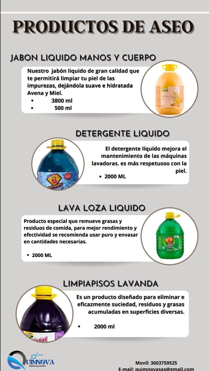 SOMOS UNA EMPRESA ESPECIALIZADA EN LA VENTA Y DISTRIBUCION DE PRODUCTOS PARA LA INDUSTRIA, EL HOGAR. Y EL CONTROL DE PLAGAS. COMO INSUMOS PARA EL ASEO TALES COMO JABONES, DETERGENTES, LIMPIAPIZOS, DESINFECTANTES Y DESENGRASANTES. ENVASES DE VIDRIO ,PLASTICO Y TAPAS. MATERIA PRIMA PARA LA PREPARACION DE FORMULAS MAGISTRALES TALES COMO EL BICARBONADO, ACIDOS, BENZOATO, SODA CAUSTICA, CLORURO Y SULFATOS. PRODUCTOS PARA LA LIMPIEZA O EL MANTENIMIENTO DE LAS PISCINAS COMO EL CLORO EN PASTILLAS CON ALGUICIDAS, CLARIFICANTES, SULFATO DE COBRE, CLARIFLOC Y CLORO GRANULADO. FRAGANCIAS PARA EL HOGAR Y EL USO PERSONAL. GLICERINA, HIPOCLORITO DE SODIO, CREOLINA, THINNER, VARSOL, FORMOL, ALCOHOL ANTISEPTICO, ALOCHOL ETILICO INDUSTRIAL Y ALCOHOL EXTRANEUTRO.