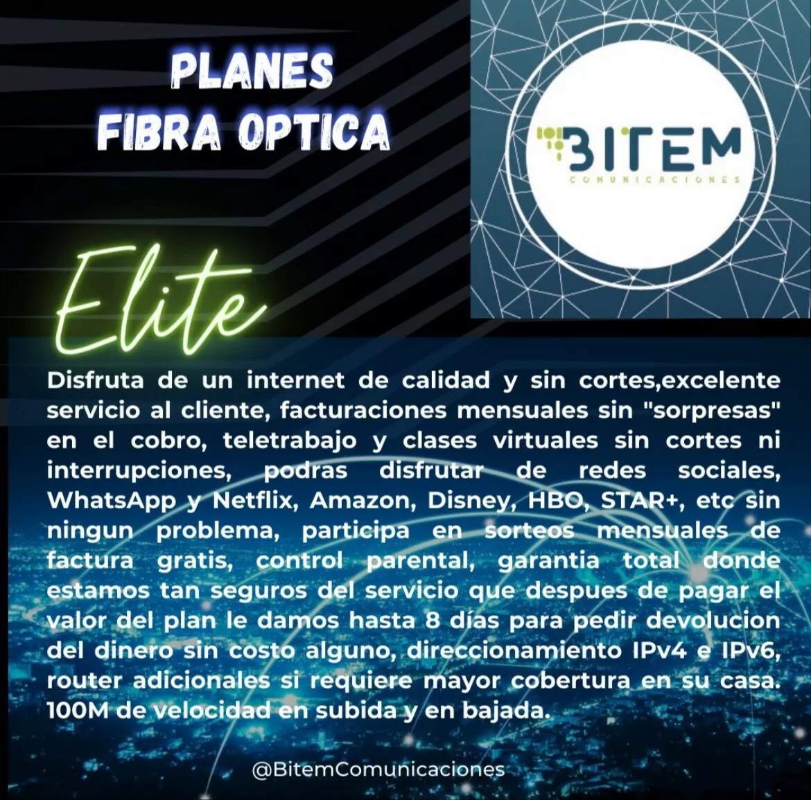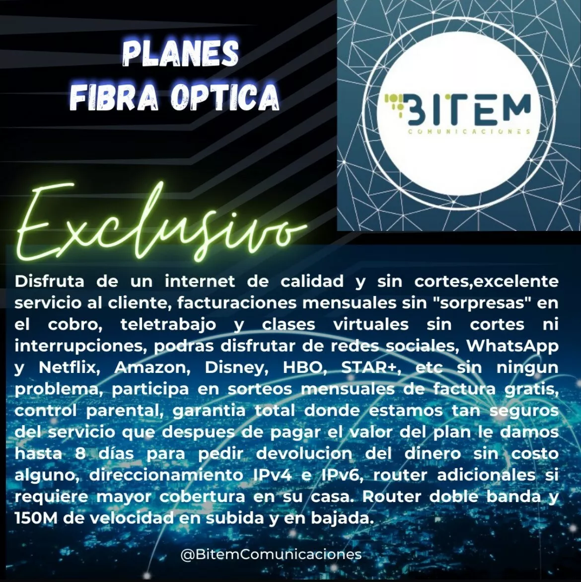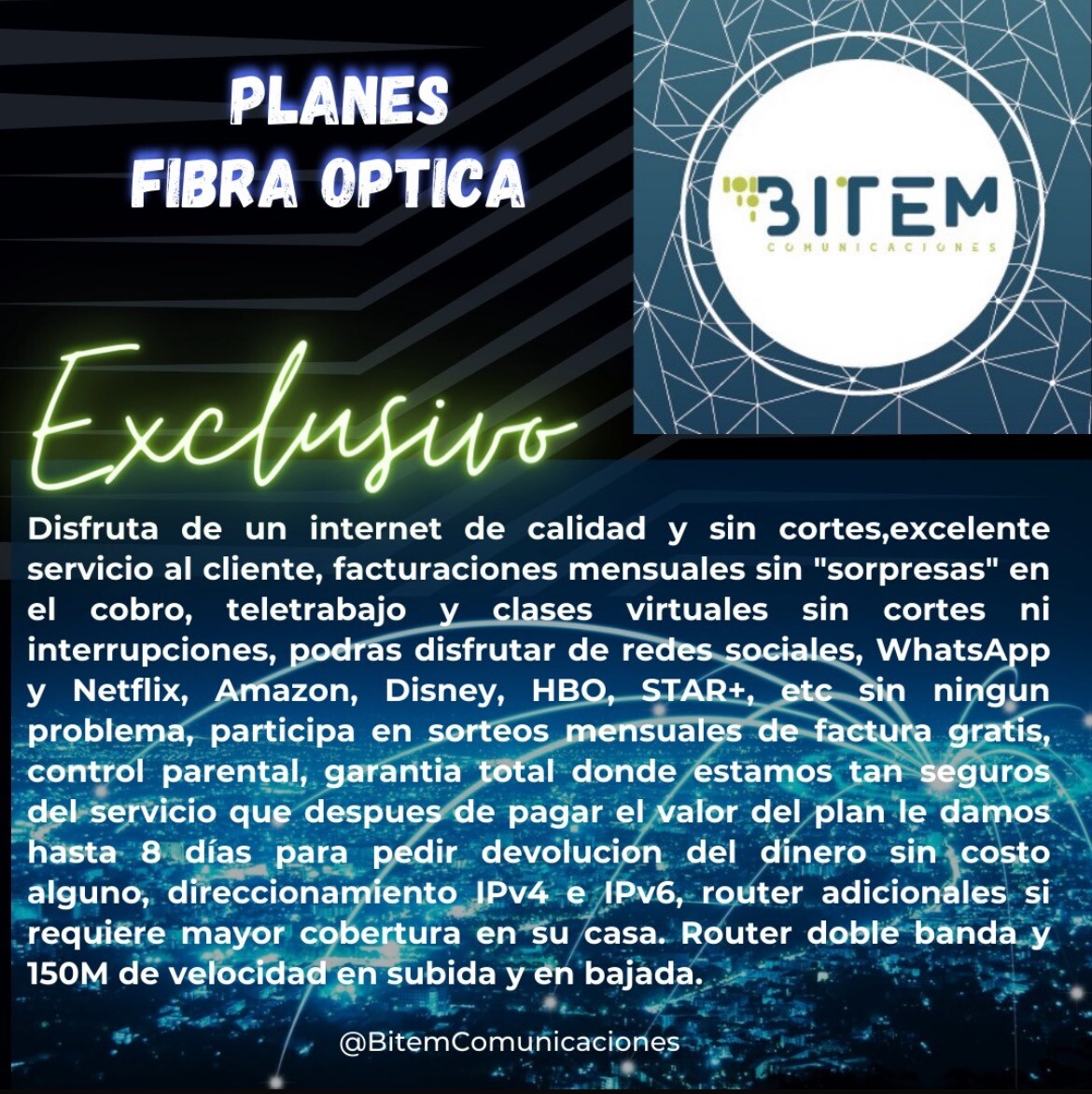 Somos proveedores de servicios de Internet de alta calidad, un excelente servicio al cliente y una estabilidad del servicio garantizada. Tenemos infraestructura en fibra óptica y radio enlace, llevamos 7 años en el marcado conectando a empresas muy importantes de la región y a hogares que también se merecen poder contar con nuestros servicios. Nuestro Internet es para todos.