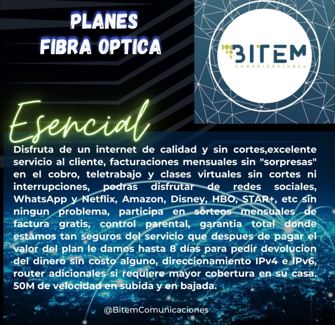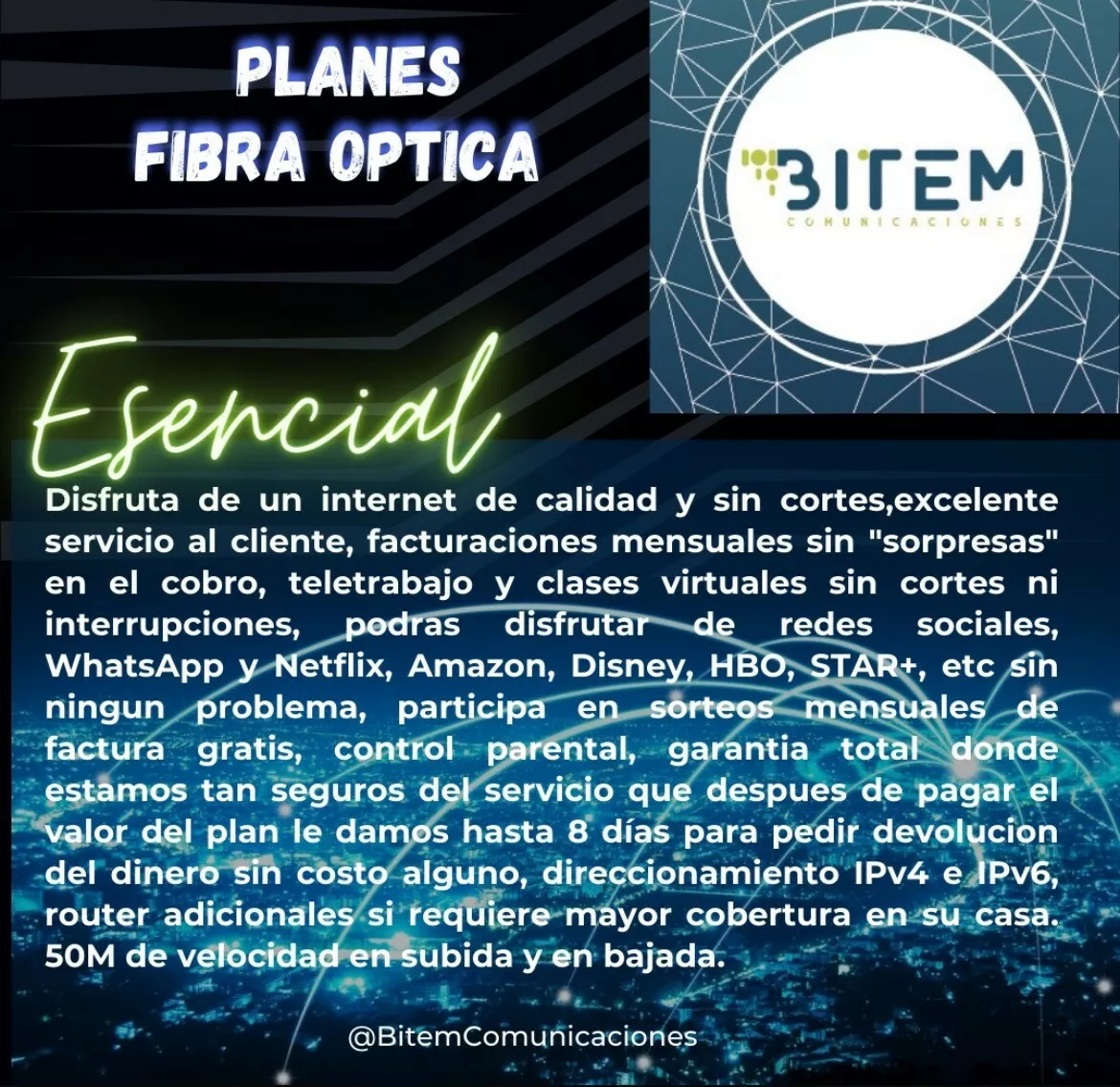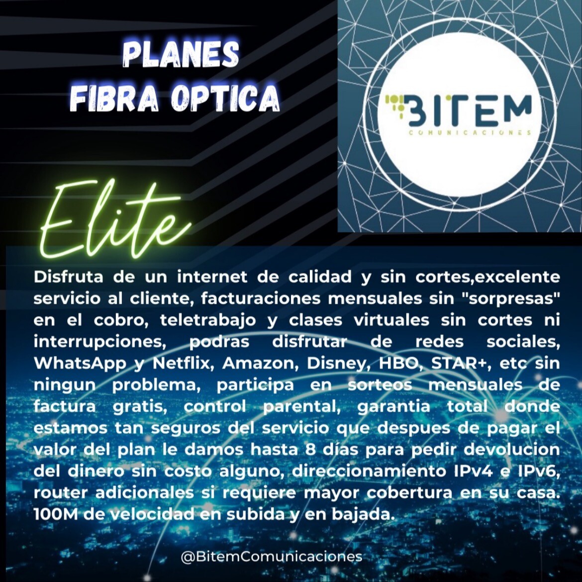 Somos proveedores de servicios de Internet de alta calidad, un excelente servicio al cliente y una estabilidad del servicio garantizada. Tenemos infraestructura en fibra óptica y radio enlace, llevamos 7 años en el marcado conectando a empresas muy importantes de la región y a hogares que también se merecen poder contar con nuestros servicios. Nuestro Internet es para todos.