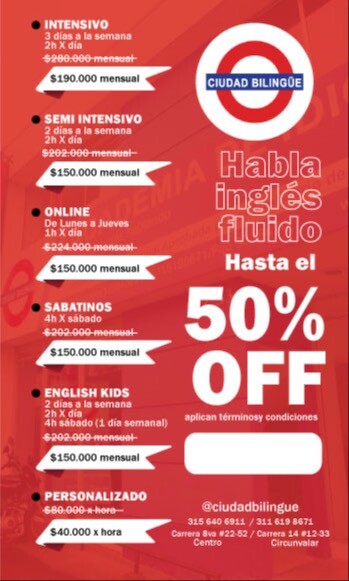 PRESENTANDO TU TARJETA O QR COLDESCUENTOS OBTEN UN 50% DE DESCUENTO SOBRE EL VALOR DE MATRICULA Y UN 10% DE DESCUENTO SOBREEL VALOR DE NUESTROS CURSOS.