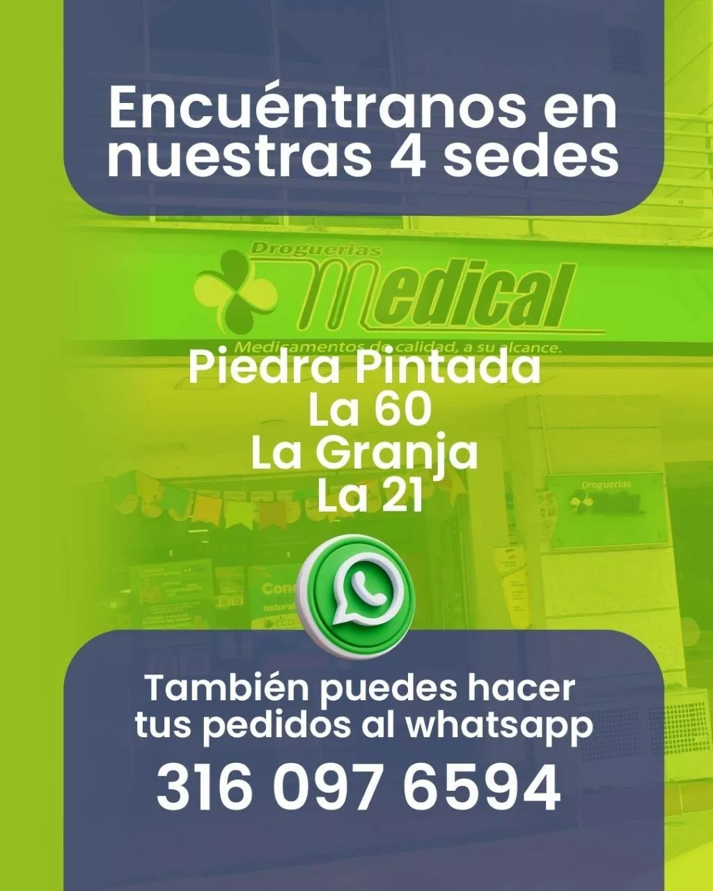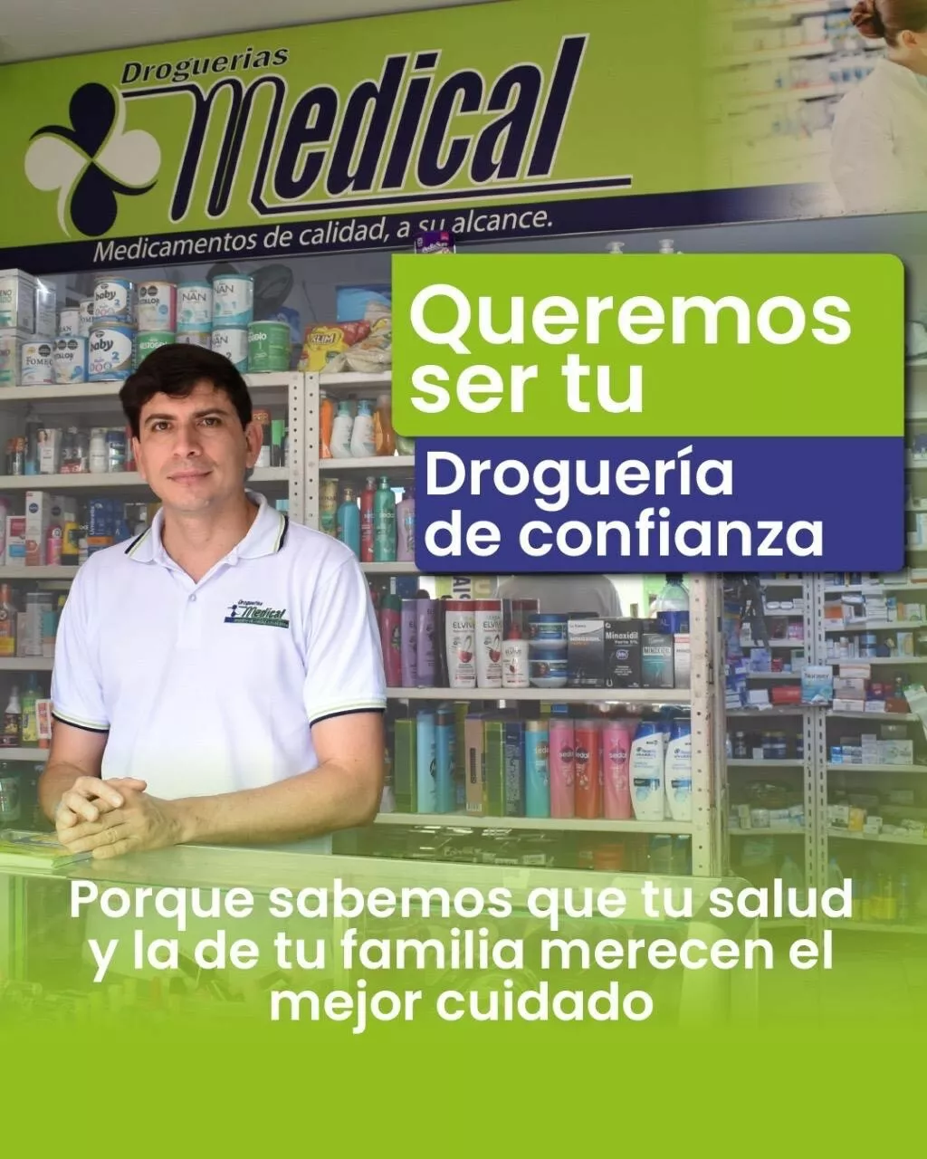 Droguerías Medical, Somos una farmacia comprometida con la salud y el bienestar de la comunidad, desde hace aproximadamente 32 años ofrecemos una amplia variedad de medicamentos de calidad (genéricos y comerciales), productos para el cuidado y la belleza personal, suplementos nutricionales, asesoría especializada con la confianza de recibir siempre la mejor atención y orientación profesional.