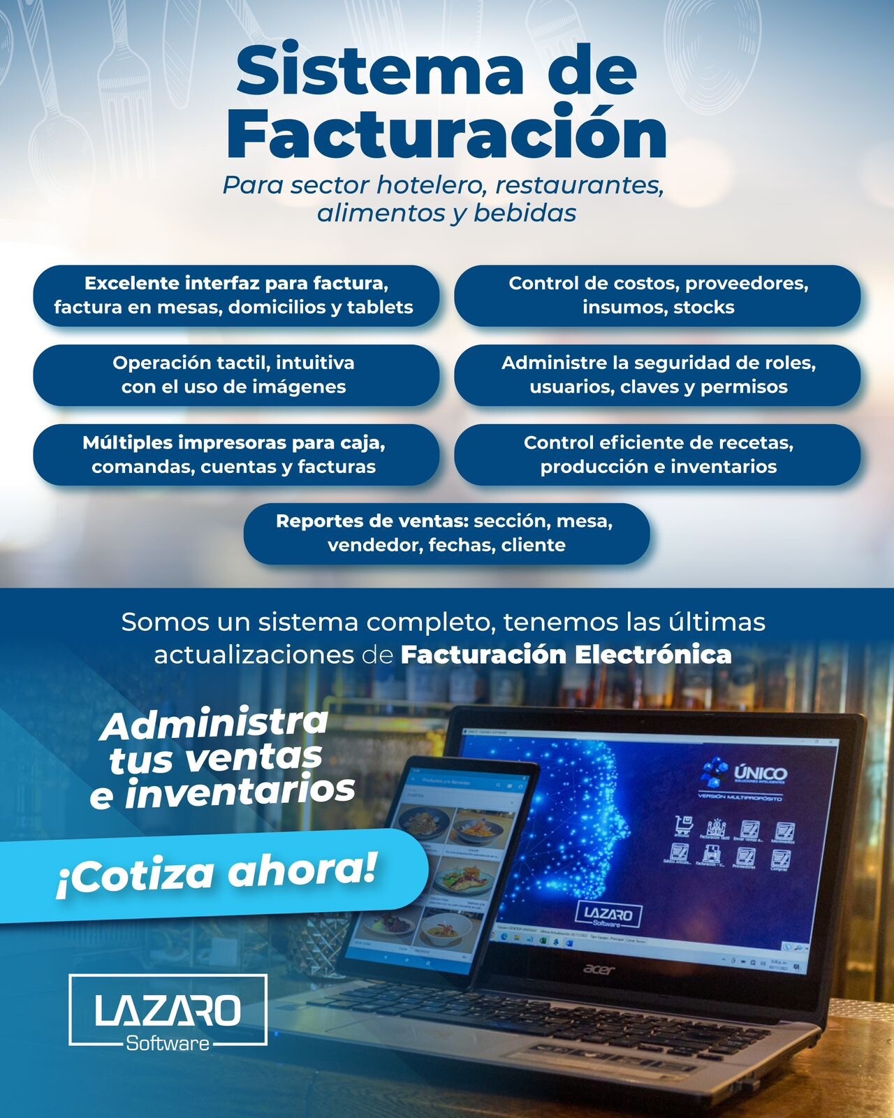 Lázaro Software, es una empresa 100% Tolimense que tiene 20 años en el mercado dedicados a desarrollar soluciones informáticas eficientes; nos hemos destacado por la flexibilidad y calidad de nuestro producto, por el compromiso hacia todos nuestros clientes y el excelente servicio.