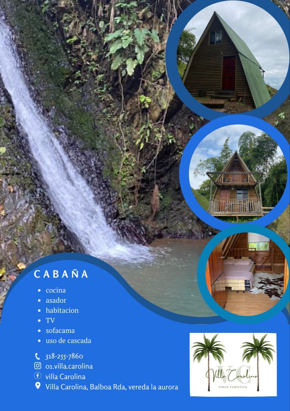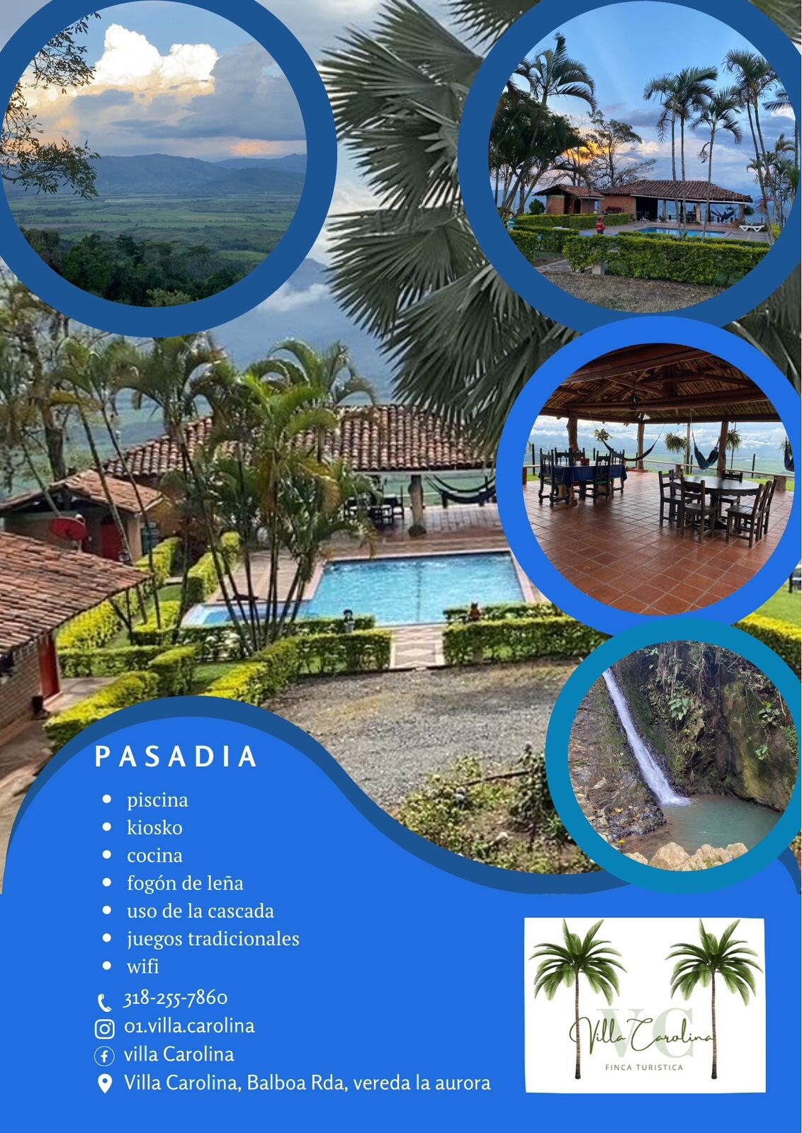 Finca Villa Carolina estamos ubicados en balboa Risaralda vereda la aurora, a 4 kilómetros de la Virginia Risaralda, ofrecemos servicio de alojamiento, pasadía a grupos familiares, empresariales, amigos, servicio de eventos sociales, reuniones, fiestas. contamos con un salon social, juegos tradicionales, servicio de wifi, piscina, sendero ecológico, cascada y piscina naturas con capacidad para 10 personas.